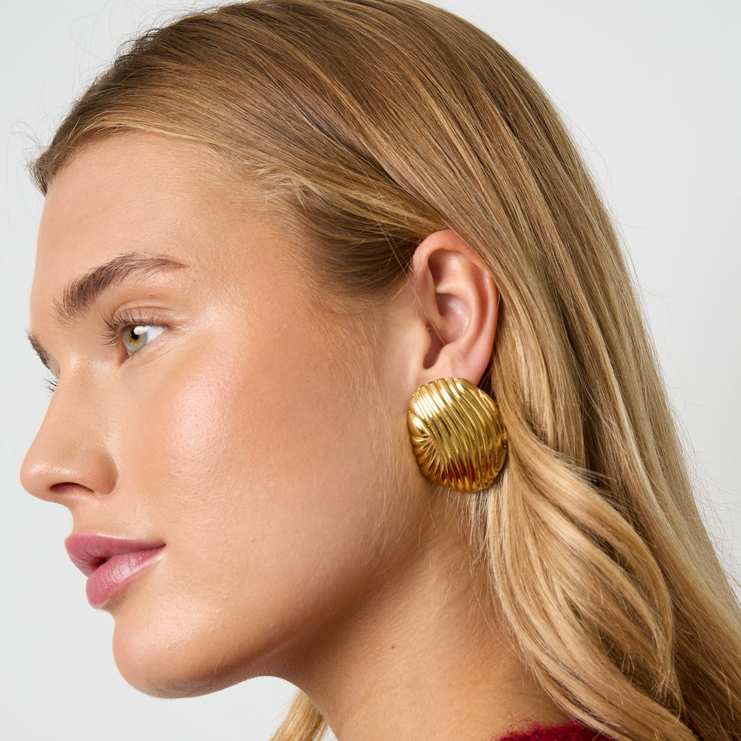 Die Maelle Ohrringe sind ein Statement für stilbewusste Eleganz. Ihr gewelltes, glänzendes Design erinnert an ikonische Schmuckstücke vergangener Jahrzehnte – voluminös, skulptural und dabei angenehm leicht. Die weiche Form fängt das Licht auf subtile Weise ein und verleiht jedem Look eine luxuriöse Note.