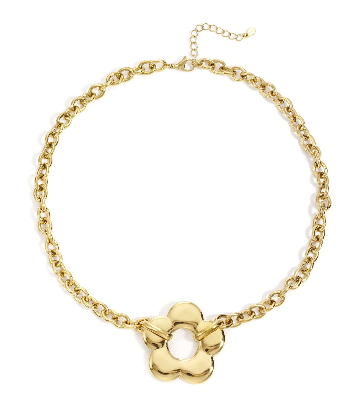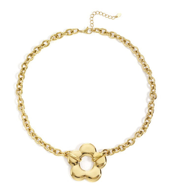 Die Maribel Kette ist ein echtes Statement-Piece: eine massive Ankerkette aus goldfarbenem Edelstahl, die von einem glänzenden Blütenanhänger vollendet wird. Das Design vereint verspielte Leichtigkeit mit markanter Stärke – perfekt für alle, die Schmuck mit Persönlichkeit lieben.