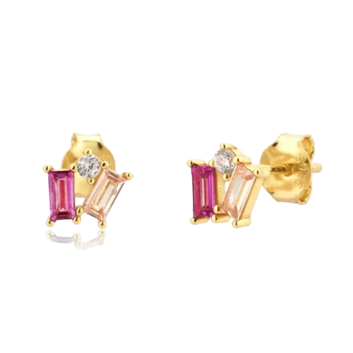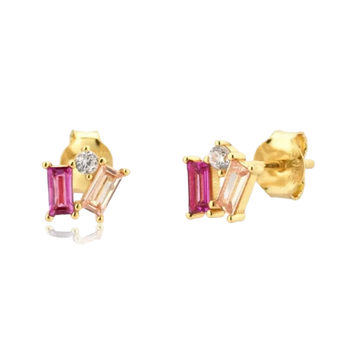 Diese kleinen Statement-Studs spielen mit Kontrasten: drei Steine in unterschiedlichen Schliffen treffen auf ein cleanes, goldfarbenes Setting. Zwei Baguette-Cuts plus ein runder Stein oben – wirkt modern, grafisch und trotzdem super tragbar. Perfekt, wenn du Farbe liebst, aber es nicht “laut” haben willst.