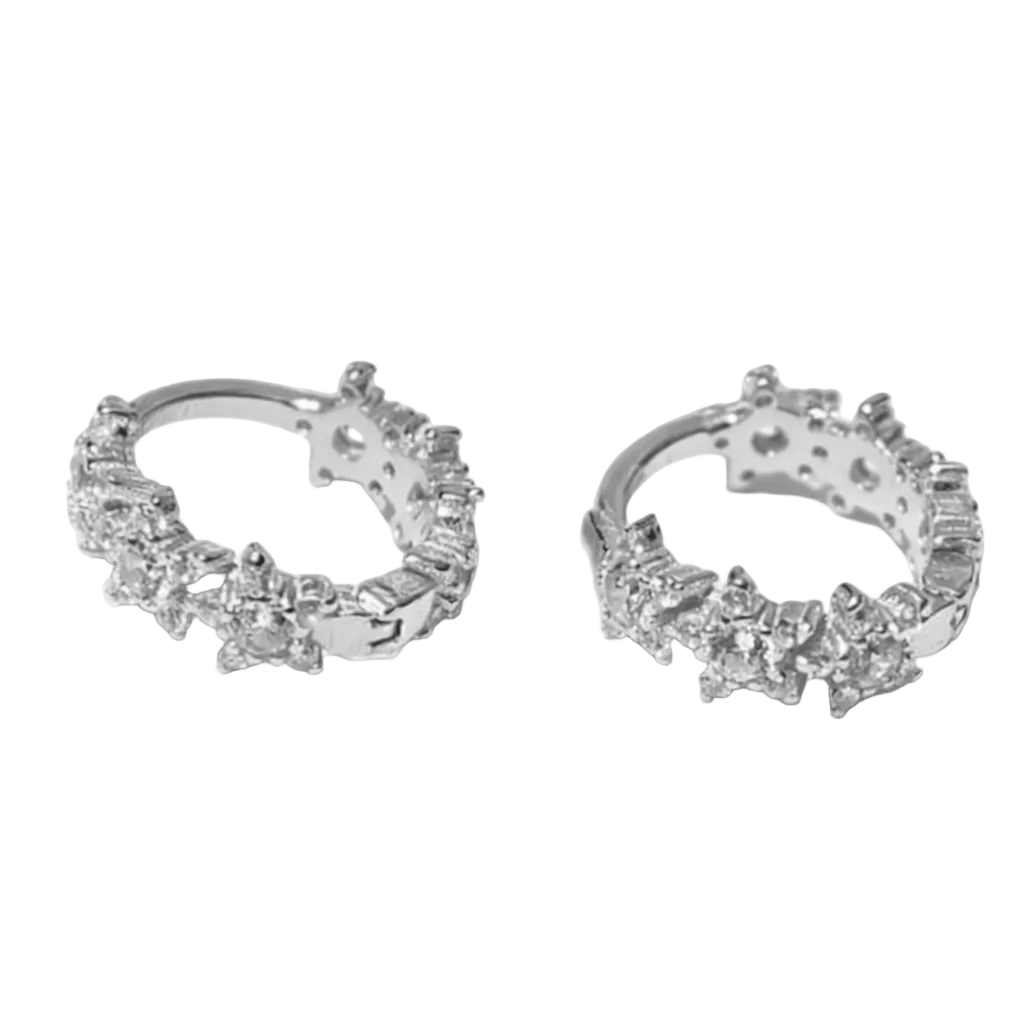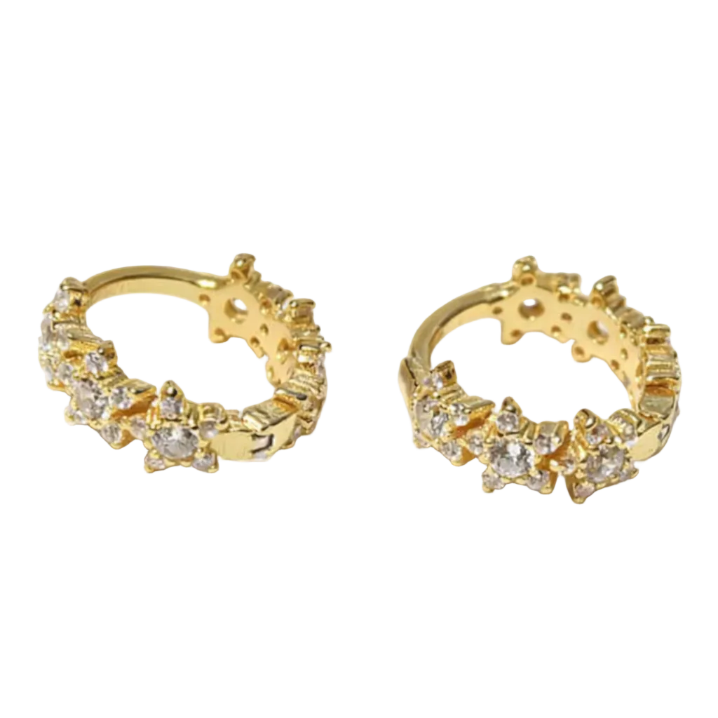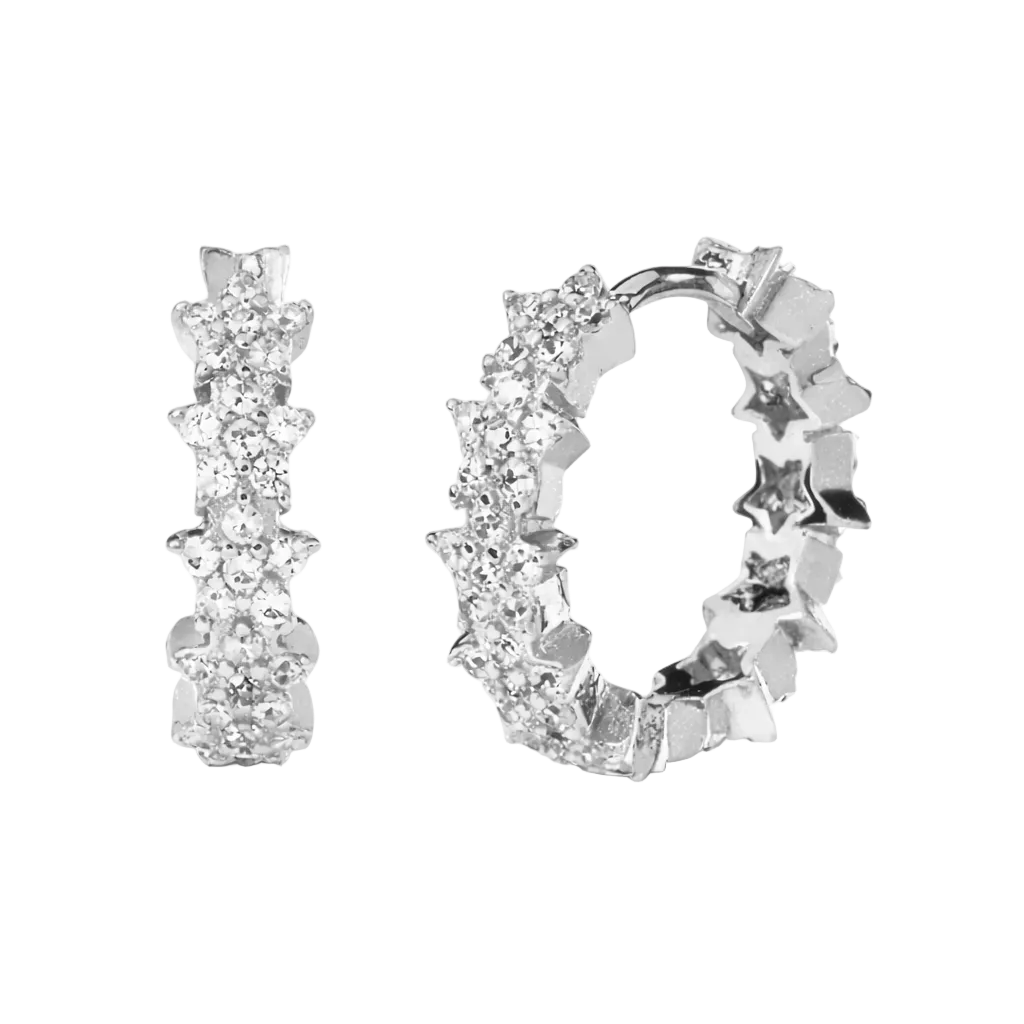 Diese kleinen Statement-Creolen bringen verspielten Glam in deinen Everyday-Look: Die Oberfläche ist mit funkelnden Zirkonia und kleinen Stern-Elementen gestaltet, wodurch ein besonderer, fast himmlischer Sparkle-Effekt entsteht. Trotz des detailreichen Designs wirken die Hoops modern, fein und perfekt fürs Ear-Stacking.