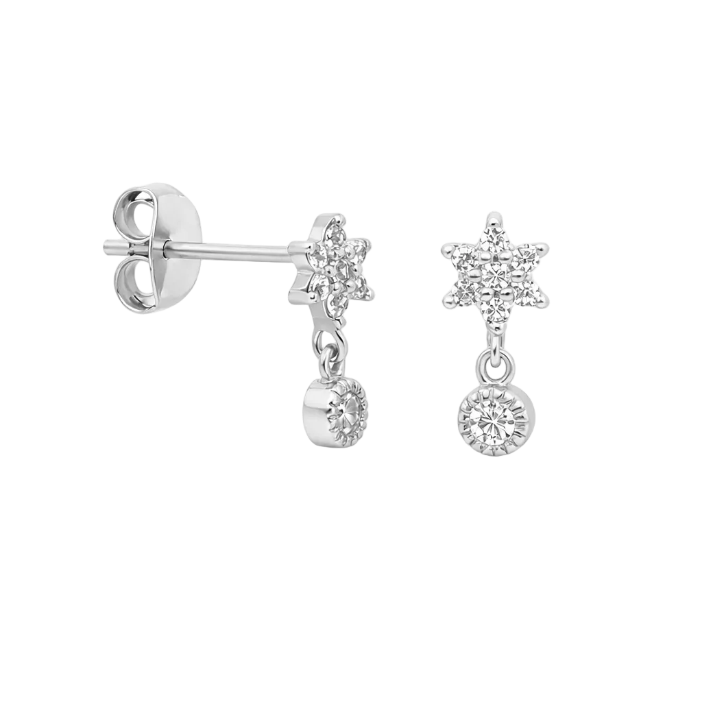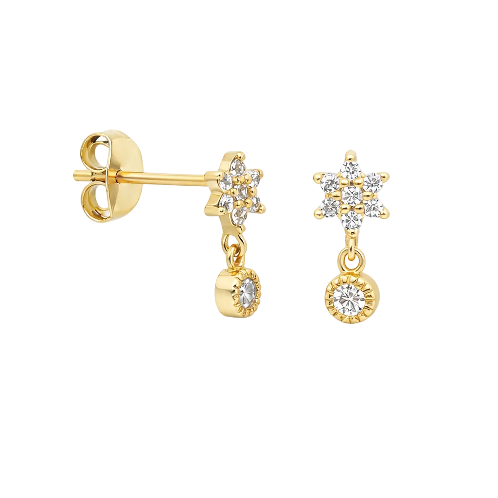 Polaris ist dein kleiner „North Star“-Moment fürs Ohr: ein zarter Stern aus glitzernden Zirkonia, darunter ein fein gefasster, runder Zirkonia-Anhänger, der bei jeder Bewegung sanft mitschwingt. Gefertigt aus 925 Sterling Silber – wahlweise vergoldet (18K) oder Silber-Finish – wirkt Polaris elegant, modern und absolut alltagstauglich.