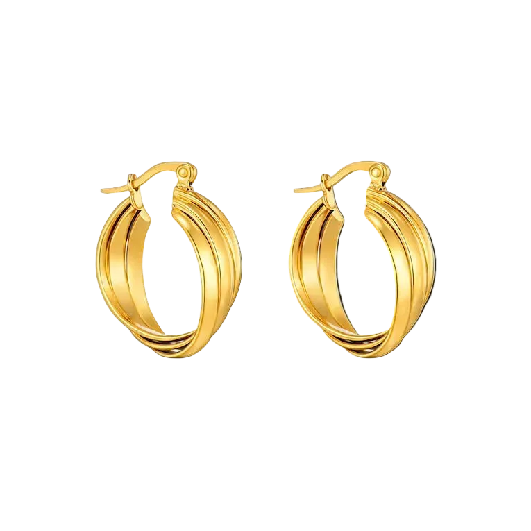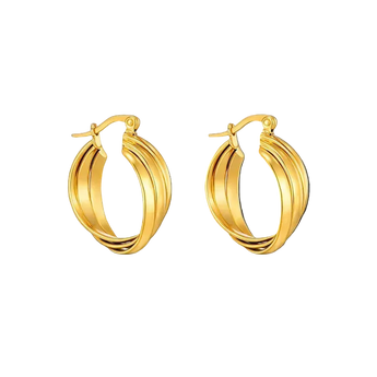 Diese voluminösen Creolen aus Edelstahl sind der Inbegriff von “effortless statement”: Durch die dreifach gerillte Form wirkt der Hoop wie ein Layering aus mehreren Ringen – dabei ist es ein cleanes Piece mit maximalem Glow. Glatt poliert, warm goldfarben und perfekt, wenn du deinem Look sofort mehr Präsenz geben willst.