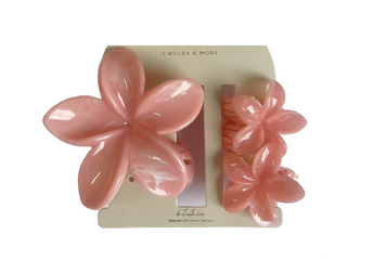 - Florale Designs: Drei Klammern mit Hibiskusblüten in sanft schimmernden Farben