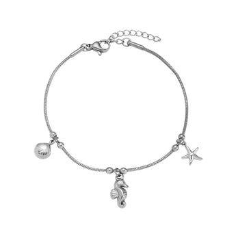 Mit dem Martinique Armband trägst du das Gefühl von Sonne, Sand und Meer direkt am Handgelenk. Die zarte Armkette aus robustem Edelstahl ist verziert mit einem Seestern, einem Seepferdchen und einer Muschel – kleine Details, die sommerliche Leichtigkeit und stilvollen Minimalismus vereinen. Erhältlich in glänzendem Gold oder Silber.