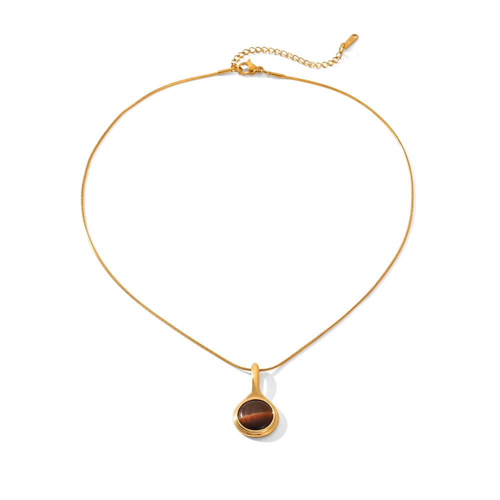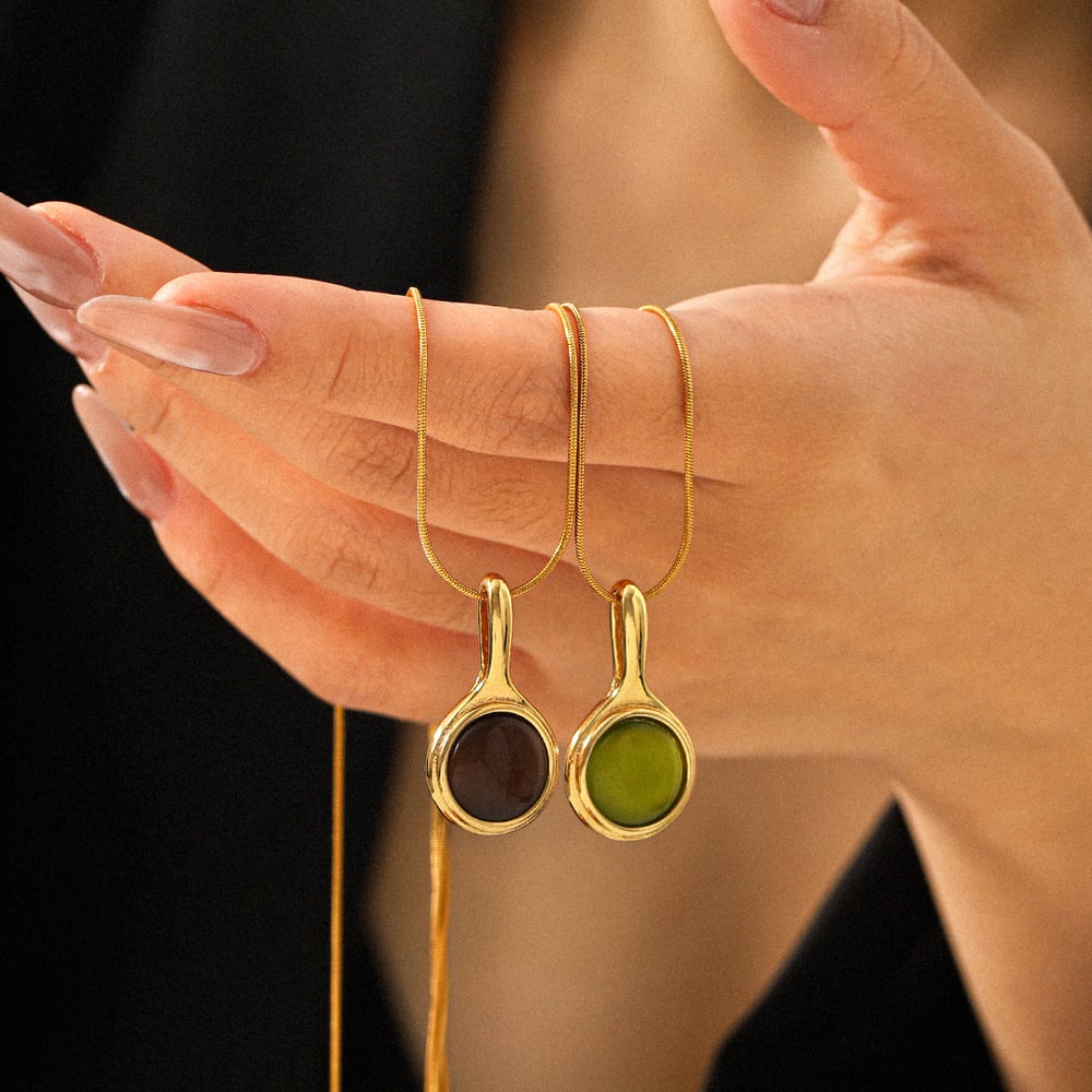 Die Orbit ist minimal, modern und trotzdem ein Blickfang: Ein runder Cabochon-Stein in glänzender Fassung trifft auf eine feine Snake-Kette, die sich besonders smooth an den Hals legt. In Olive Green oder Amber Brown wirkt der Stein wie ein kleiner Farbakzent, der jedes Outfit sofort edler macht. Durch die klare, runde Form passt Orbit zu fast jedem Stil – von cleanem Office-Look bis Dinner-Date – und lässt sich super mit weiteren Ketten kombinieren.