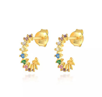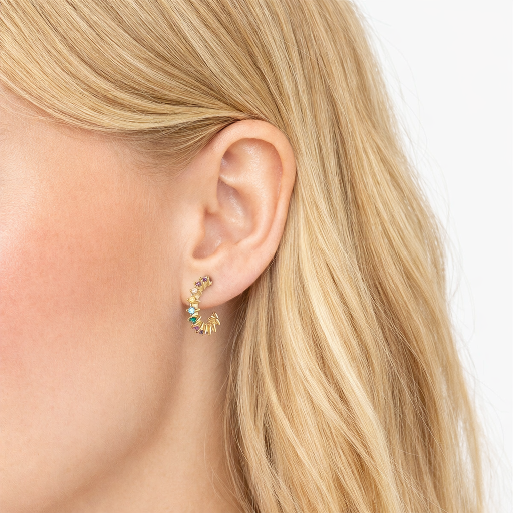Dieser kleine Huggie-Ohrstecker bringt sofort gute Laune ins Ear-Stacking: eine halb offene Silhouettemit bunten, funkelnden Steinen als charmantes Finish. Der Look ist verspielt, aber trotzdem clean – perfekt für jeden Tag oder als Farbakzent am Abend.