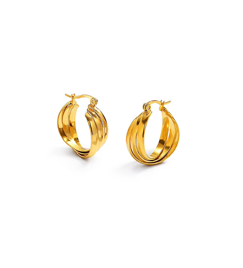 Diese voluminösen Creolen aus Edelstahl sind der Inbegriff von “effortless statement”: Durch die dreifach gerillte Form wirkt der Hoop wie ein Layering aus mehreren Ringen – dabei ist es ein cleanes Piece mit maximalem Glow. Glatt poliert, warm goldfarben und perfekt, wenn du deinem Look sofort mehr Präsenz geben willst.
